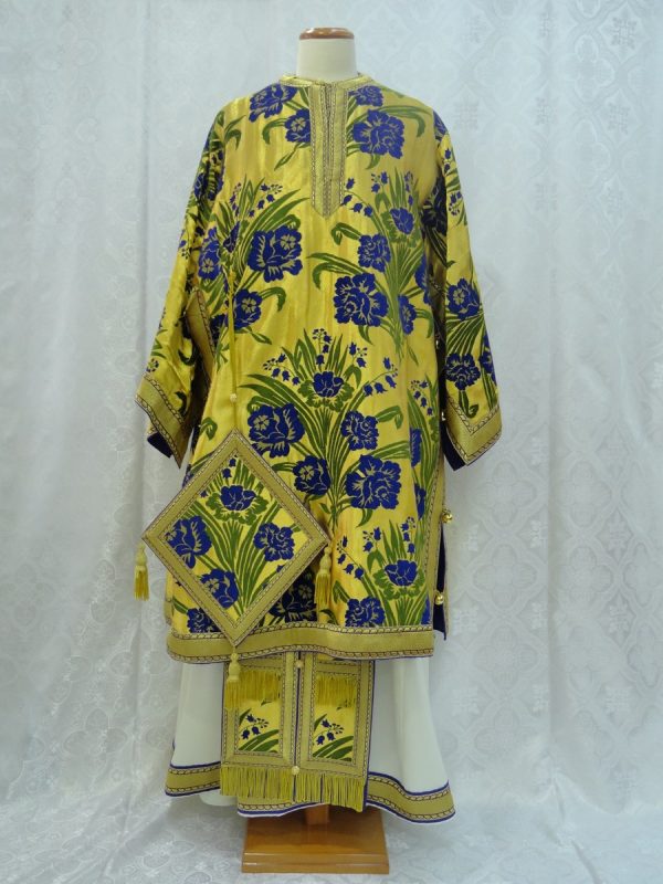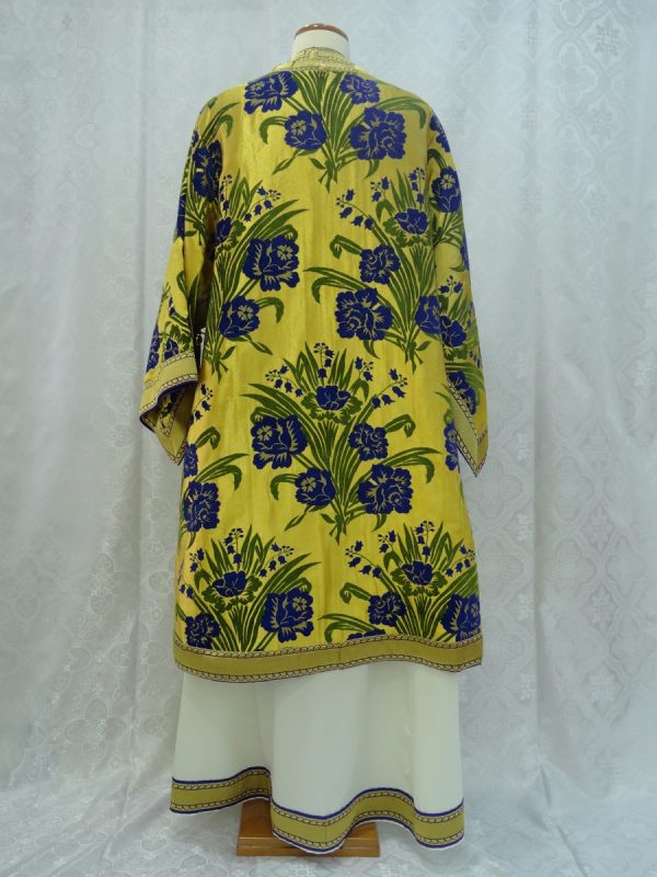 Αρχιερατικά άμφια κατασκευασμένα από βελούδο και μεταλλική χρυσοκλωστή. Το ύφασμα είναι αρκετά χοντρό και άρα κατάλληλα για χειμώνα. Δεν είναι ετοιμοπαράδοτα καθώς πρέπει να κατασκευαστούν στα μέτρα του αρχιερέα. Δείτε παρακάτω τα μέτρα που χρειαζόμαστε για την κατασκευή των αμφίων.