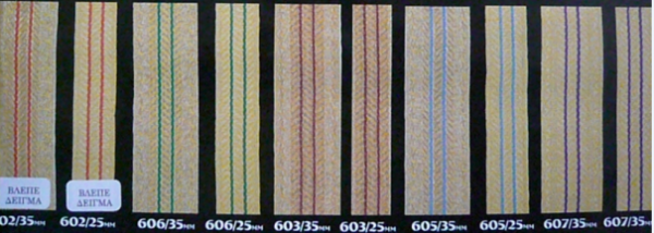 γκρενά 603, θαλασσί 605, κόκκινο 602, μωβ 607, πράσινο 606
