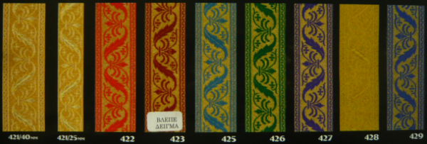 Ιερατικά γαλόνια σε δύο φάρδη: 2.5εκ. και 4.0εκ. Επιλέξτε χρώμα από το χρωματολόγιο και με τον κωδικό του κάθε χρώματος. Οι τιμές είναι μέτρο.