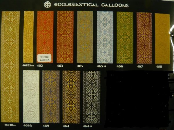 Εκκλησιαστικά γαλόνια σε δύο φάρδη: 2.5εκ., και 4.0εκ. Επιλέξτε χρώμα απ’το χρωματολόγιο με τον κωδικό του κάθε χρώματος. Οι τιμές είναι το μέτρο.