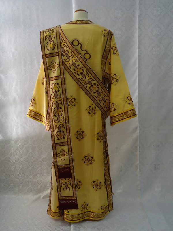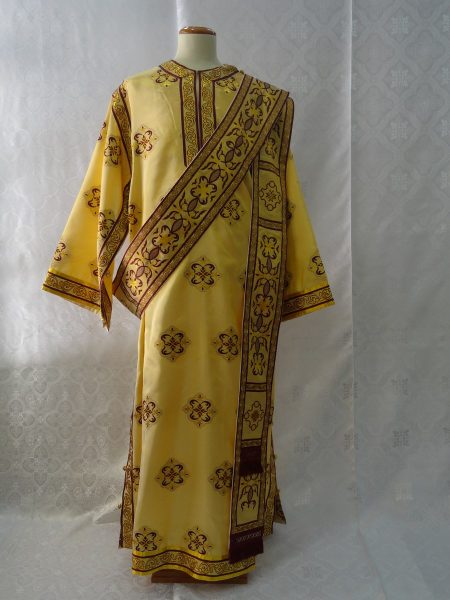 Διακονικά άμφια σε Αγιορείτικο στιλ. Κατασκευασμένα από ελαφρύ μεταξωτό υφαντό ύφασμα χωρίς φόδρα. Δεν είναι ετοιμοπαράδοτα καθώς πρέπει να κατασκευαστούν στα μέτρα του ιερέα. Δείτε παρακάτω τα μέτρα που χρειαζόμαστε για την κατασκευή αμφίων.