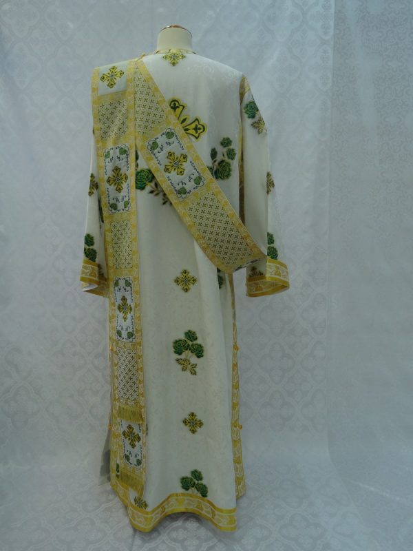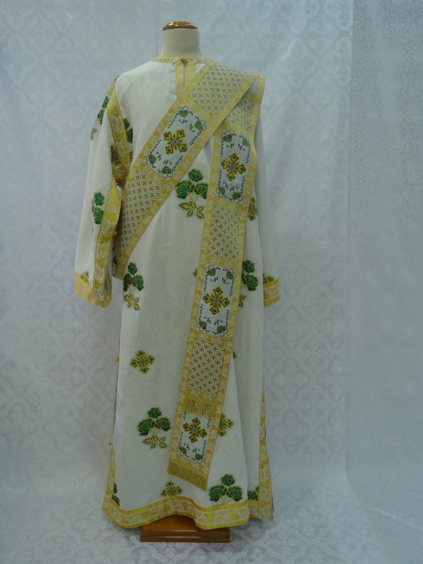 Διακονικά άμφια με τον Φλωρεντιανό σταυρό. Κατασκευασμένα από ελαφρύ μεταξωτό υφαντό ύφασμα χωρίς φόδρα. Δεν είναι ετοιμοπαράδοτα καθώς πρέπει να κατασκευαστούν στα μέτρα του ιερέα. Δείτε παρακάτω τα μέτρα που χρειαζόμαστε για την κατασκευή αμφίων.