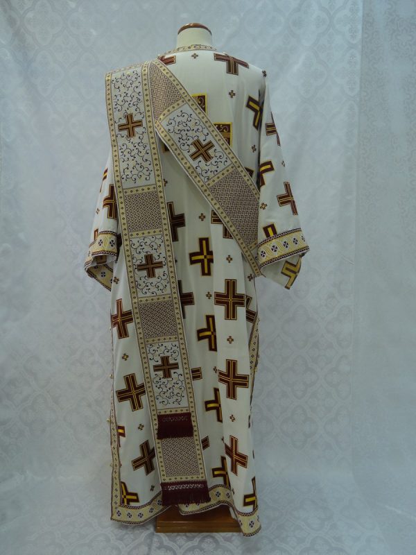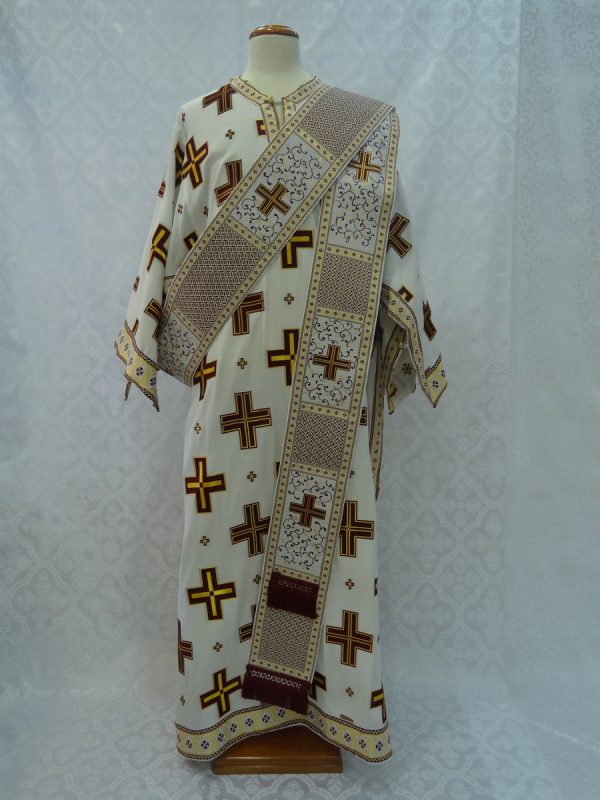 Διακονικά άμφια σε Αγιορείτικο στιλ. Κατασκευασμένα από ελαφρύ μεταξωτό υφαντό ύφασμα χωρίς φόδρα. Δεν είναι ετοιμοπαράδοτα καθώς πρέπει να κατασκευαστούν στα μέτρα του ιερέα. Δείτε παρακάτω τα μέτρα που χρειαζόμαστε για την κατασκευή αμφίων.
