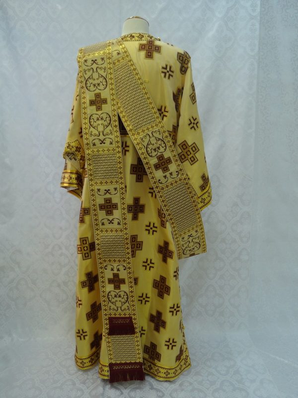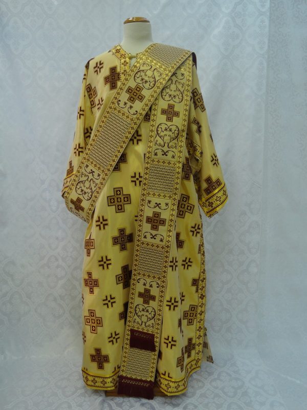 Διακονικά άμφια σε Αγιορείτικο στιλ. Κατασκευασμένα από ελαφρύ μεταξωτό υφαντό ύφασμα χωρίς φόδρα. Δεν είναι ετοιμοπαράδοτα καθώς πρέπει να κατασκευαστούν στα μέτρα του ιερέα. Δείτε παρακάτω τα μέτρα που χρειαζόμαστε για την κατασκευή αμφίων.