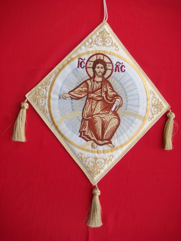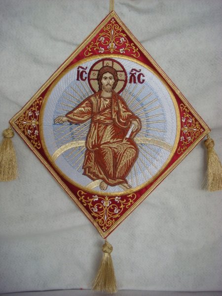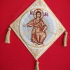 Επιγονάτιο χρυσοκέντητο. Διατίθεται με φόντο δύο χρώματα, βυσσινή και λευκό. Μπορούμε κατόπιν παραγγελίας να το κατασκευάσουμε και σε άλλα χρώματα με την ίδια παράσταση.