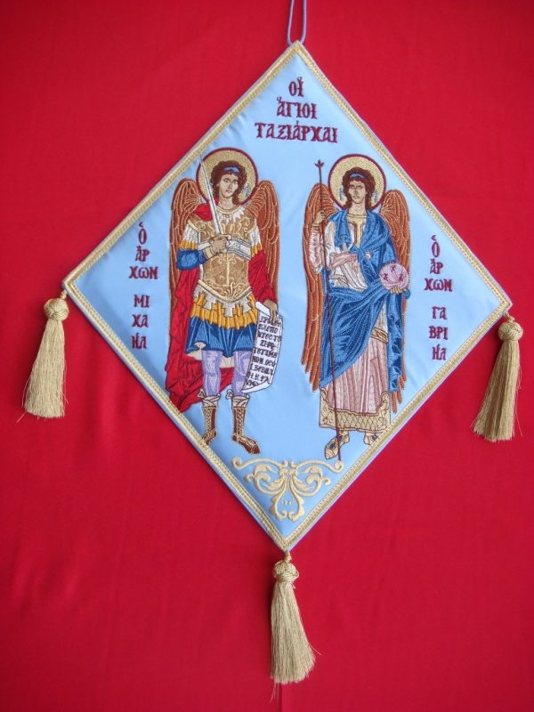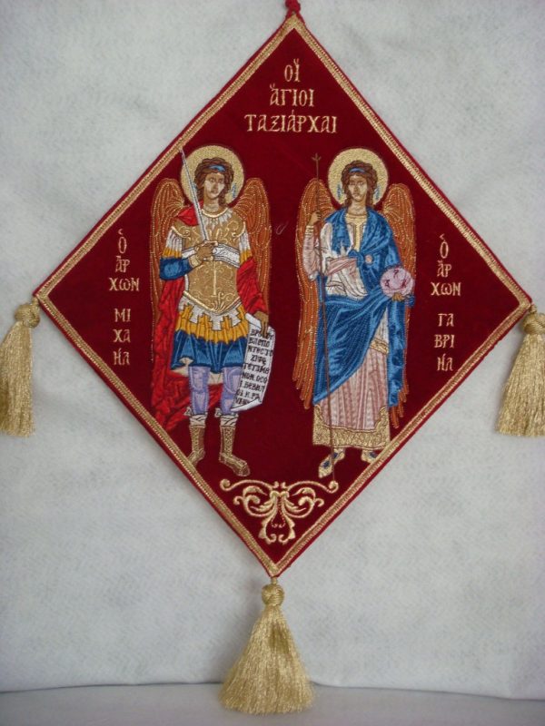 Επιγονάτιο χρυσοκέντητο με τους Άγιους Ταξιάρχες. Υπάρχει στα χρώματα που βλέπετε αλλά υπάρχει δυνατότητα να φτιαχτεί και σε άλλες αποχρώσεις κατόπιν παραγγελίας.