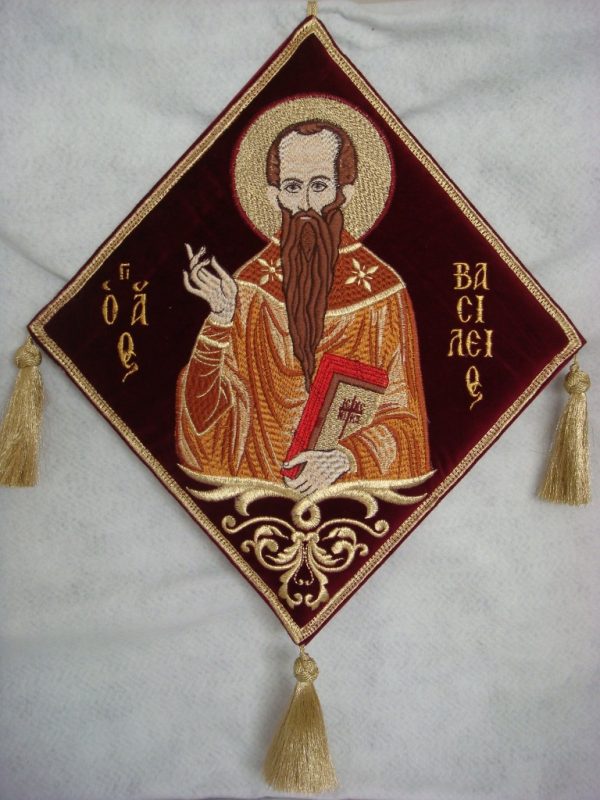 Επιγονάτιο χρυσοκέντητο με τον Άγιο Βασίλειο. Υπάρχει δυνατότητα να φτιαχτεί και σε άλλα χρώματα εκτός από αυτό που βλέπετε στη φώτο.