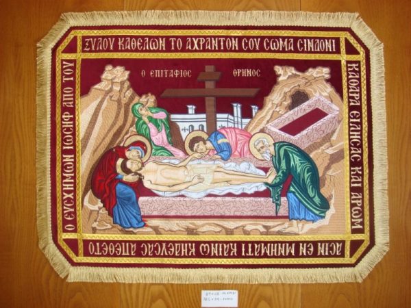 Επιτάφιος χρυσοκέντητος σε βελούδο. Διαστάσεις με κρόσσι: 89εκ. Χ 68εκ. και χωρίς κρόσσι: 79εκ. Χ 59εκ.