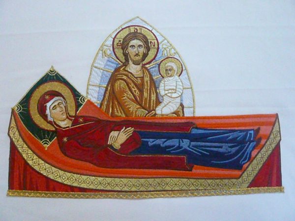 Χρυσοκεντημένη παράσταση με την Κοίμηση Της Θεοτόκου. Υπάρχει ετοιμοπαράδοτη σε μέγεθος 42εκ μήκος και 29εκ. ύψος.