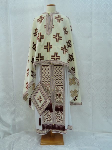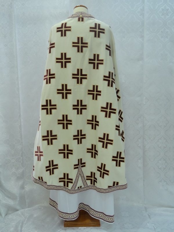 Ιερατικά άμφια σε στιλ πολυσταύρι. Κατασκευάζεται από ελαφρύ υφαντό-βαμβακερό ύφασμα χωρίς φόδρα. Δεν είναι ετοιμοπαράδοτα καθώς πρέπει να κατασκευαστούν στα μέτρα του ιερέα. Δείτε παρακάτω τα μέτρα που χρειαζόμαστε για την κατασκευή αμφίων.
