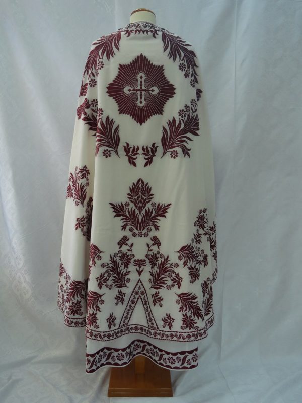 Ιερατικά άμφια σε στιλ αναγέννησης. Κατασκευάζεται από ελαφρύ υφαντό-μεταξωτό ύφασμα χωρίς φόδρα. Δεν είναι ετοιμοπαράδοτα καθώς πρέπει να κατασκευαστούν στα μέτρα του ιερέα. Δείτε παρακάτω τα μέτρα που χρειαζόμαστε για την κατασκευή αμφίων.