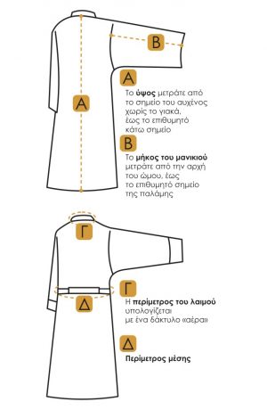 Μπορείτε να δείτε παρακάτω ένα ενδεικτικό σχέδιο για να παίρνετε σωστά μέτρα. Επίσης καλό είναι να μας αναφέρετε οποιαδήποτε ιδιαίτερη ανάγκη σας σε σχέση με την κατασκευή των αμφίων. Επικοινωνήστε μαζί μας στο info@iereas.gr ή καλέστε μας στο 26610-37426