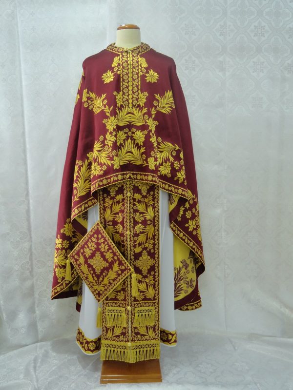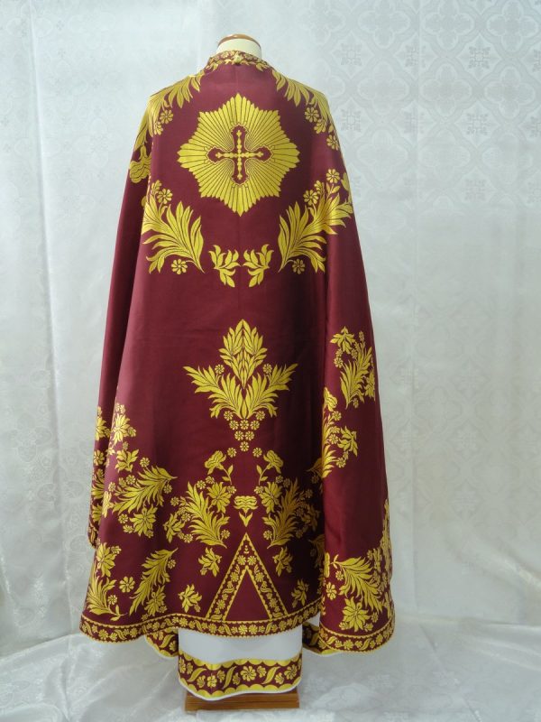 Ιερατικά άμφια σε στιλ αναγέννησης. Κατασκευάζεται από ελαφρύ υφαντό-μεταξωτό ύφασμα χωρίς φόδρα. Δεν είναι ετοιμοπαράδοτα καθώς πρέπει να κατασκευαστούν στα μέτρα του ιερέα. Δείτε παρακάτω τα μέτρα που χρειαζόμαστε για την κατασκευή αμφίων.