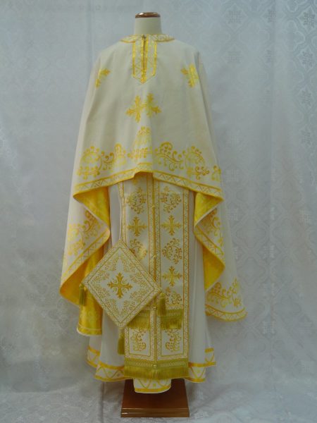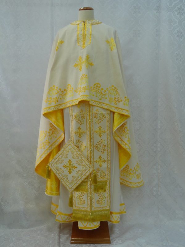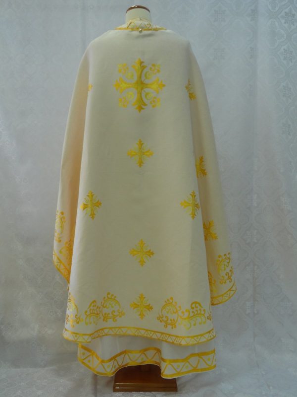 Ιερατικά άμφια σε στιλ Έφεσος. Κατασκευάζεται από υφαντό ύφασμα χωρίς φόδρα. Είναι αρκετά χοντρό και μπορεί να φορεθεί χειμώνα πιο καλά. Δεν είναι ετοιμοπαράδοτα καθώς πρέπει να κατασκευαστούν στα μέτρα του ιερέα. Δείτε παρακάτω τα μέτρα που χρειαζόμαστε για την κατασκευή αμφίων.