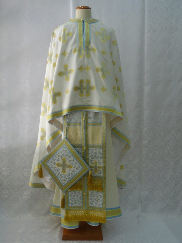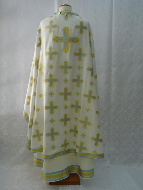 Ιερατικά άμφια σε Αγιορείτικο στιλ. Κατασκευάζεται από ελαφρύ υφαντό-μεταξωτό ύφασμα χωρίς φόδρα. Δεν είναι ετοιμοπαράδοτα καθώς πρέπει να κατασκευαστούν στα μέτρα του ιερέα. Δείτε παρακάτω τα μέτρα που χρειαζόμαστε για την κατασκευή αμφίων.