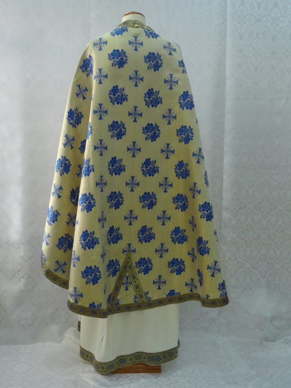 Ιερατικά άμφια σε μοναστηριακό στιλ. Κατασκευασμένα από ελαφρύ μεταξωτό υφαντό ύφασμα χωρίς φόδρα. Δεν είναι ετοιμοπαράδοτα καθώς πρέπει να κατασκευαστούν στα μέτρα του ιερέα. Δείτε παρακάτω τα μέτρα που χρειαζόμαστε για την κατασκευή αμφίων.
