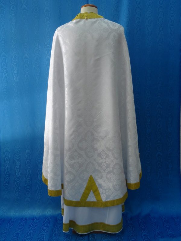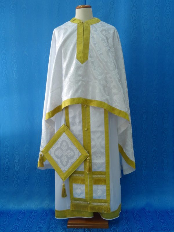 Ιερατικά άμφια κατασκευασμένα από ελαφρύ μεταξωτό/rayon ύφασμα χωρίς φόδρα. Δεν είναι ετοιμοπαράδοτα καθώς πρέπει να κατασκευαστούν στα μέτρα του ιερέα. Δείτε παρακάτω τα μέτρα που χρειαζόμαστε για την κατασκευή αμφίων.