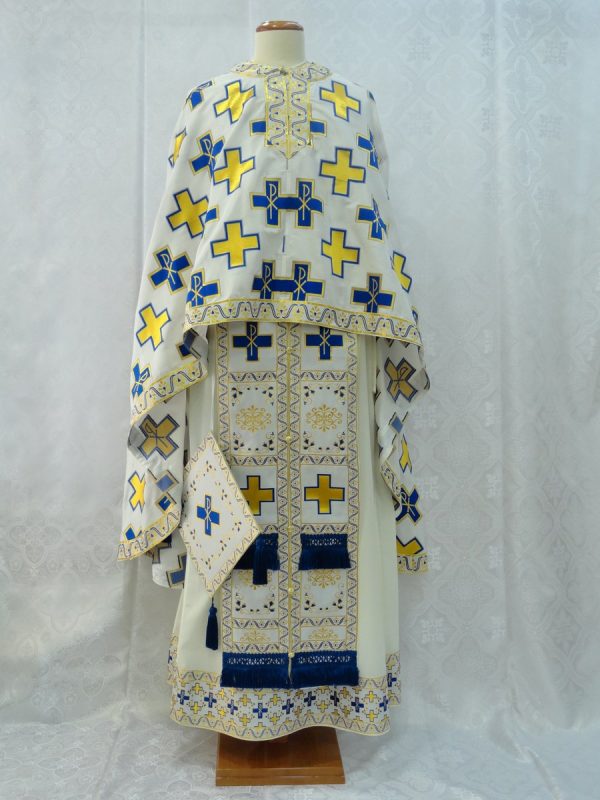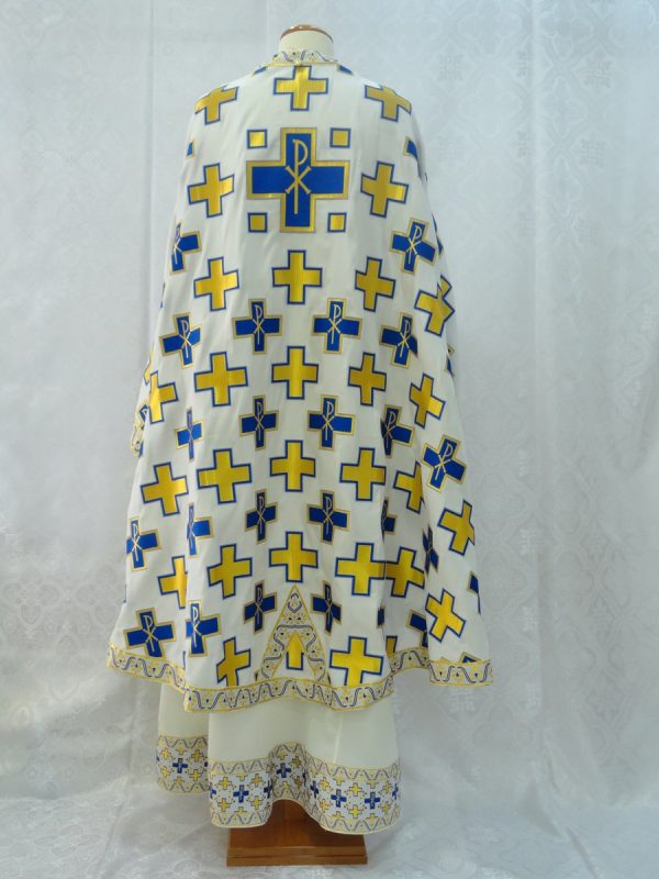 Ιερατικά άμφια σε Αγιορείτικο στιλ. Κατασκευάζεται από ελαφρύ υφαντό-μεταξωτό ύφασμα χωρίς φόδρα. Δεν είναι ετοιμοπαράδοτα καθώς πρέπει να κατασκευαστούν στα μέτρα του ιερέα. Δείτε παρακάτω τα μέτρα που χρειαζόμαστε για την κατασκευή αμφίων.
