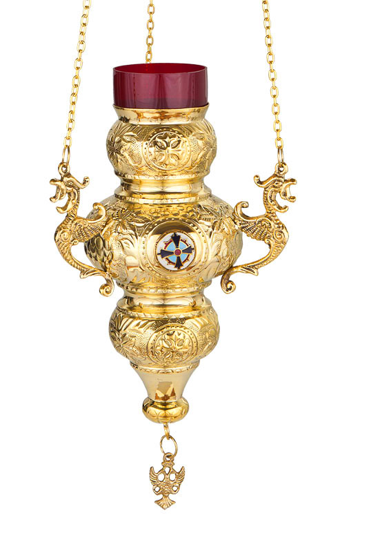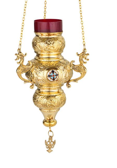 Καντήλι σε Κερκυραϊκό στιλ επίχρυσο (δε μαυρίζει) με σμαλτάκι. Διατίθεται σε τρία μεγέθη 21 εκ., 24 εκ., και 29 εκ. το μεγάλο.