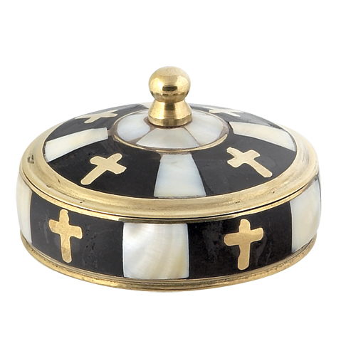 Λιβανοθήκη μπρούτζινη με φίλντισι. Διαστάσεις: διάμετρος 7εκ., ύψος 4εκ.