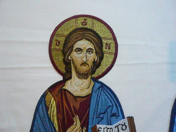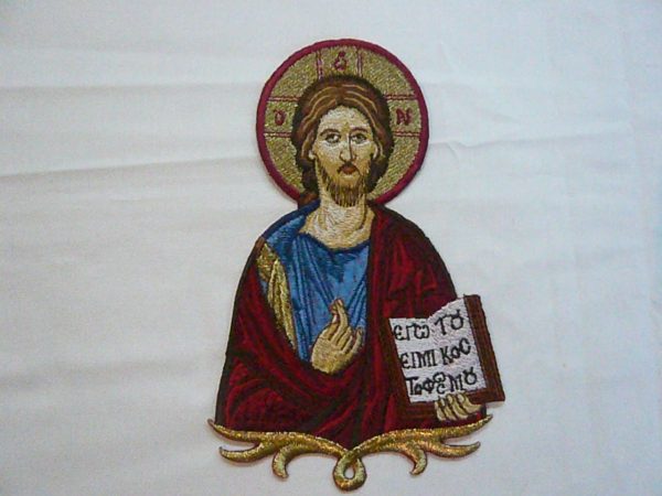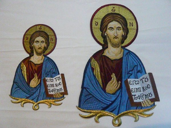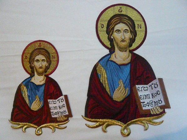 Παράσταση με τον Χριστό Ευλογών χρυσοκεντημένη. Υπάρχει σε τρία μεγέθη: μικρός με ύψος 19εκ., μεσαίος με ύψος 26εκ. και μεγάλος με ύψος 37εκ.