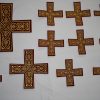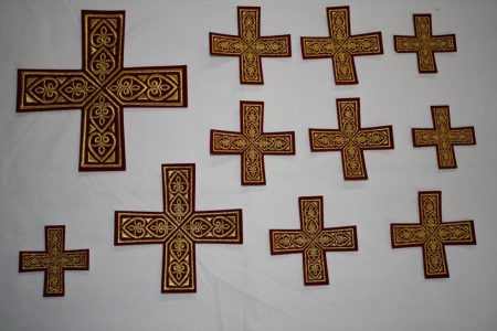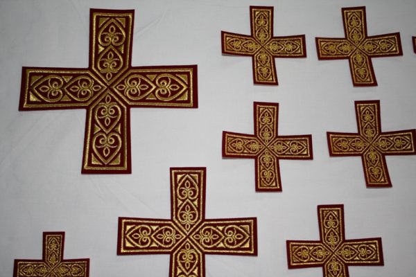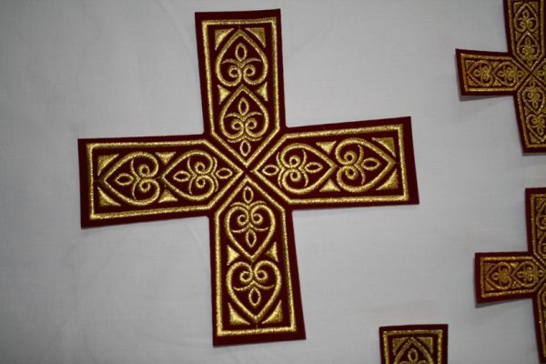 Σταυροί αμφίων σε σετ των έντεκα τεμαχίων. Το χρώμα που βλέπετε είναι χρυσό και μπορντώ. Οι συγκεκριμένοι σταυροί χρειάζονται ράψιμο στα άμφια. Μπορείτε και με σούστες να τους βάλετε και να τους βγάζετε αν πρέπει να πλυθούν τα άμφια.