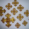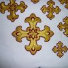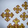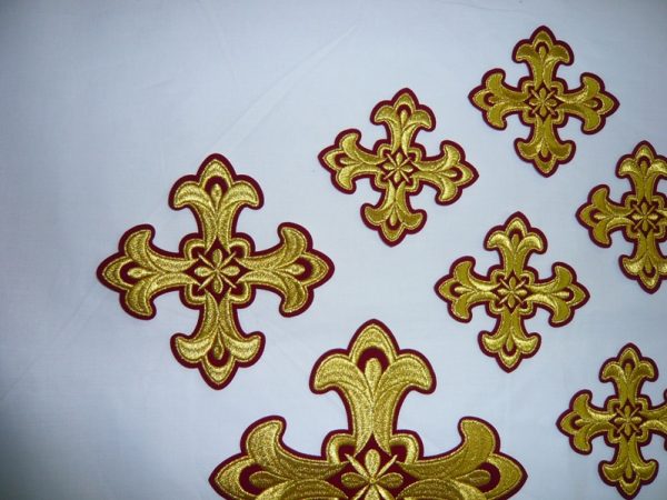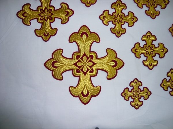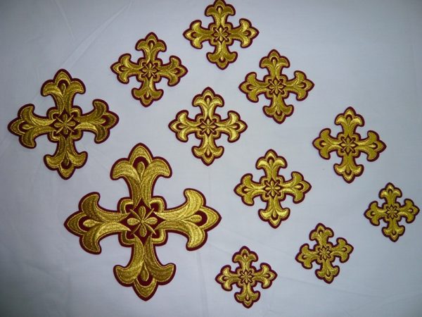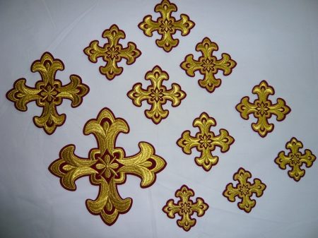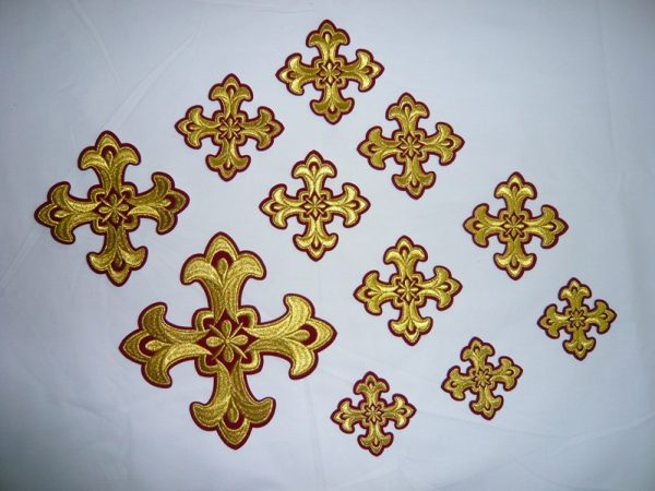 Σταυροί αμφίων σε σετ των έντεκα τεμαχίων. Το χρώμα που βλέπετε είναι χρυσό και μπορντώ. Οι συγκεκριμένοι σταυροί χρειάζονται ράψιμο στα άμφια. Μπορείτε και με σούστες να τους βάλετε και να τους βγάζετε αν πρέπει να πλυθούν τα άμφια.