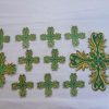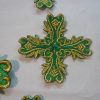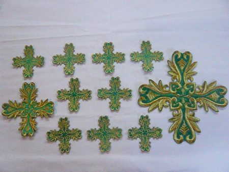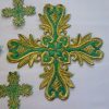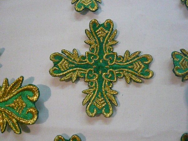 Σταυροί αμφίων σε σετ των εννιά τεμαχίων. Το χρώμα που βλέπετε είναι χρυσό και πράσινο. Οι συγκεκριμένοι σταυροί είναι και θερμοκολλητικοί δηλαδή δε χρειάζονται ράψιμο αλλά κολλάνε με το σίδερο. Ωστόσο συνιστούμε στους πελάτες να ράβουν και σε μερικά σημεία τους σταυρούς για να αντέξουν περισσότερο στο χρόνο.