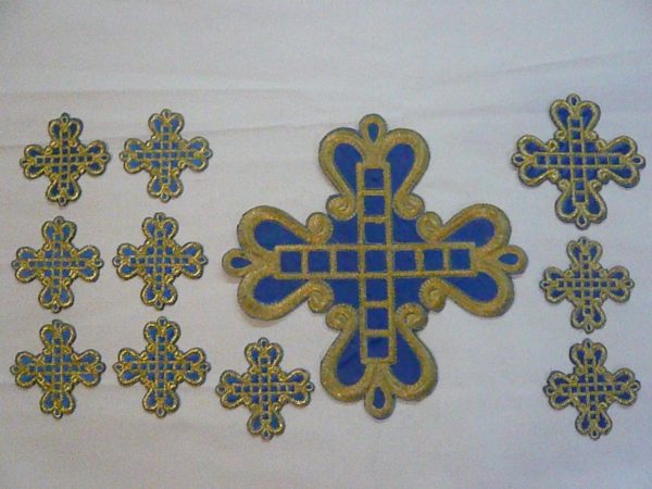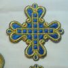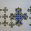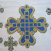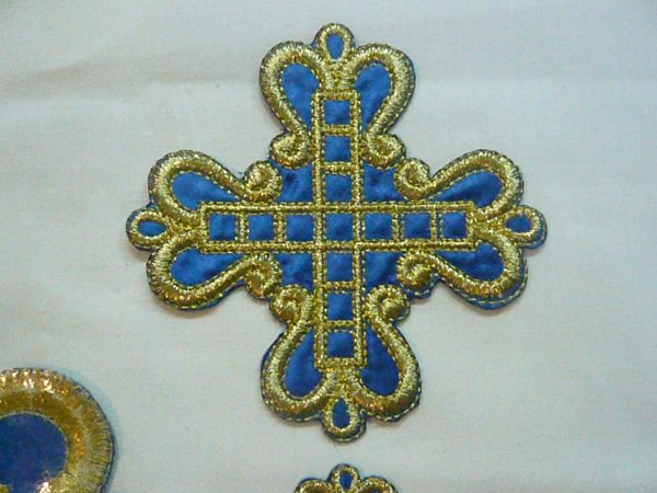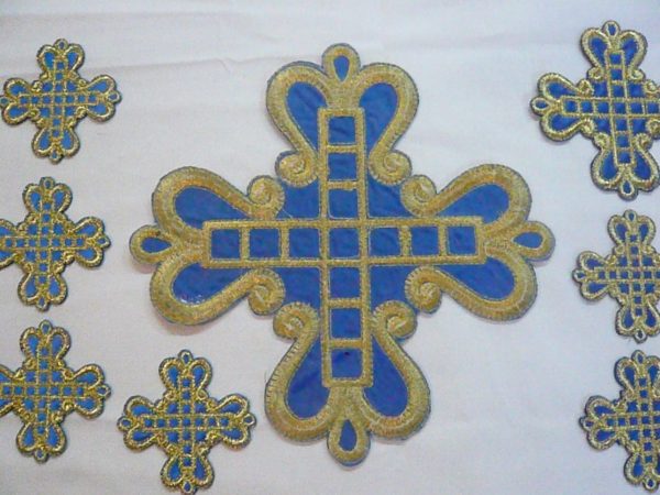 Σταυροί αμφίων σε σετ των εννιά τεμαχίων. Το χρώμα που βλέπετε είναι χρυσό και μπλε. Οι συγκεκριμένοι σταυροί είναι και θερμοκολλητικοί δηλαδή δε χρειάζονται ράψιμο αλλά κολλάνε με το σίδερο. Ωστόσο συνιστούμε στους πελάτες να ράβουν και σε μερικά σημεία τους σταυρούς για να αντέξουν περισσότερο στο χρόνο.