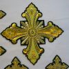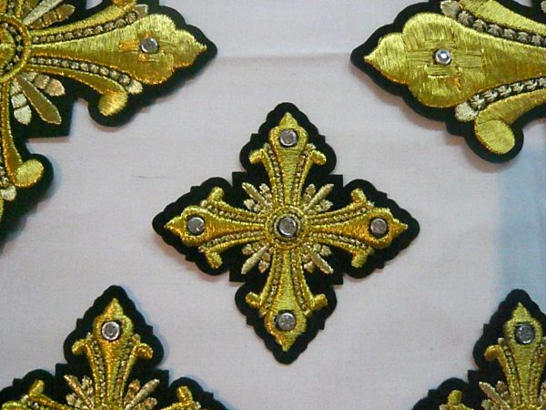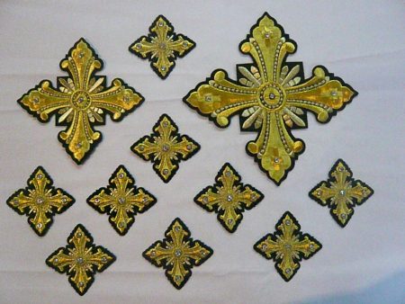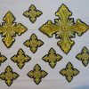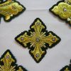 Σταυροί αμφίων σε σετ των εννιά τεμαχίων. Το χρώμα που βλέπετε είναι χρυσό και πράσινο σκούρο. Οι συγκεκριμένοι σταυροί χρειάζονται ράψιμο στα άμφια. Μπορείτε και με σούστες να τους βάλετε και να τους βγάζετε αν πρέπει να πλυθούν τα άμφια.