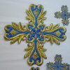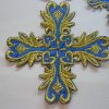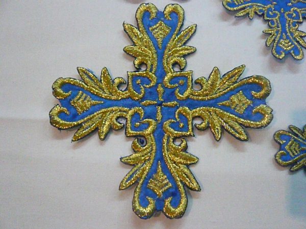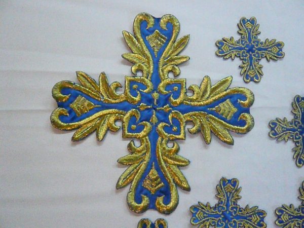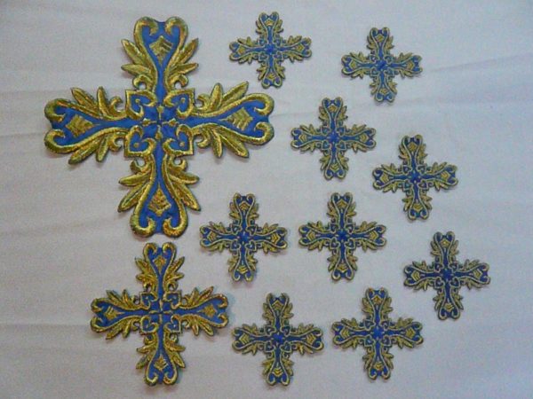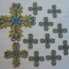 Σταυροί αμφίων σε σετ των εννιά τεμαχίων. Το χρώμα που βλέπετε είναι χρυσό και μπλε ανοιχτό. Οι συγκεκριμένοι σταυροί είναι και θερμοκολλητικοί δηλαδή δε χρειάζονται ράψιμο αλλά κολλάνε με το σίδερο. Ωστόσο συνιστούμε στους πελάτες να ράβουν και σε μερικά σημεία τους σταυρούς για να αντέξουν περισσότερο στο χρόνο.